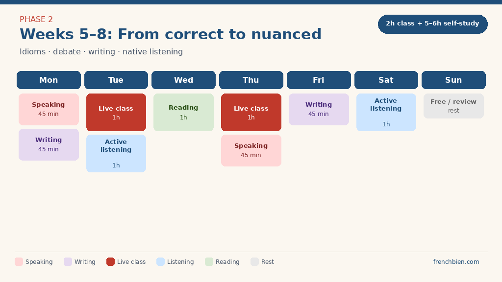 If you are not quite at B2 yet, start with our A2 to B1 in 3 months plan first. Otherwise, keep reading – here is a 12-week schedule combining two hours of weekly lessons with self-study sessions in between. Adapt it to your routine: consistency matters far more than perfection.